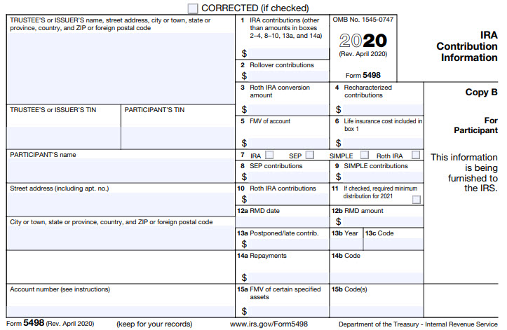 Form 8606 is used to record conversions to the IRS. A 5498 is a tax form that IRAR Trust files with the IRS on May 31 st but for the tax year 2020 this was extended to June 30th 2021. However if you or your spouse was an active participant in an employers pension plan these contributions may not be deductible.